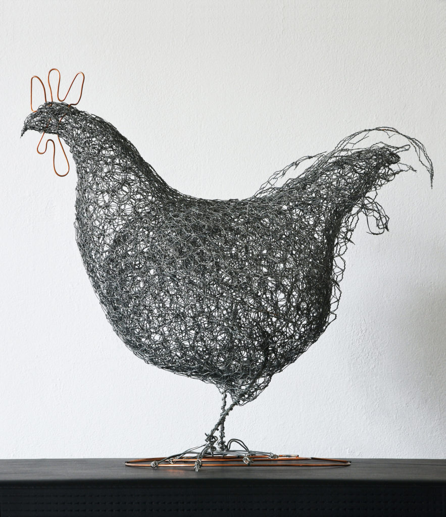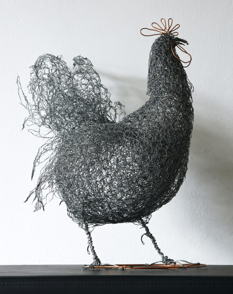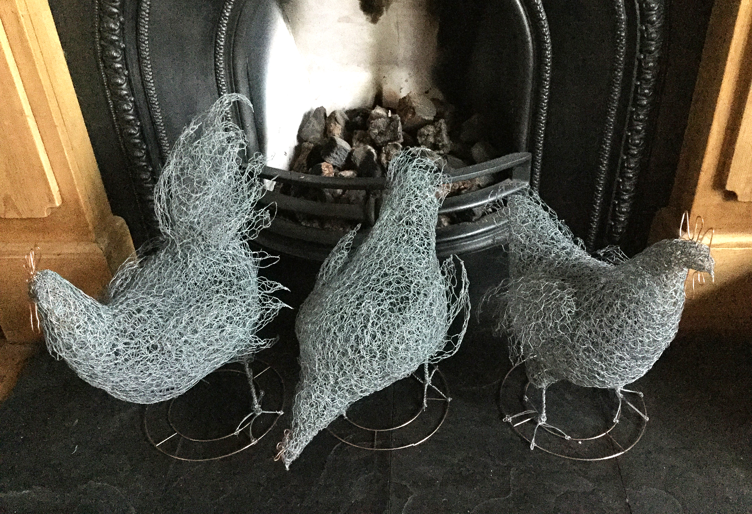 My second project, twisted relatively quickly with spiked feathers and copper wattles and combs, kept a secret until they were unveiled from crinkled pink tissue on her birthday morning!