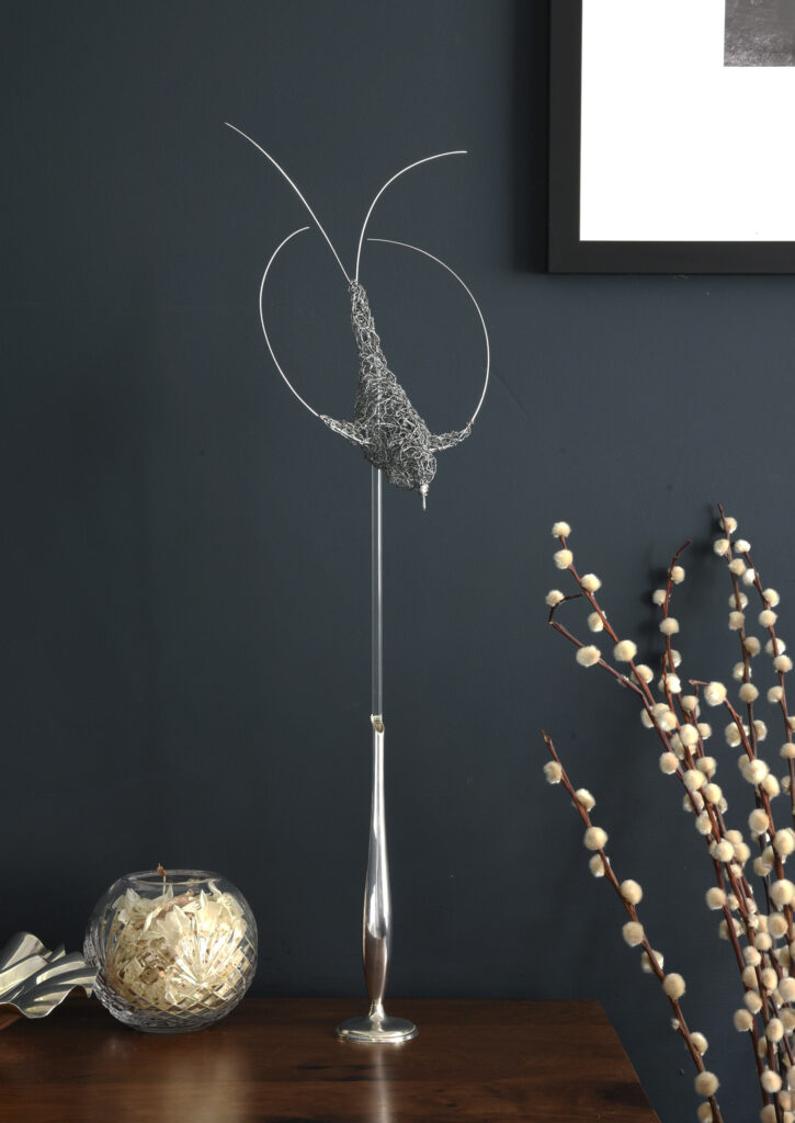 Each little bird is mounted on an acrylic rod and flies above a vintage silver plated bud vase.