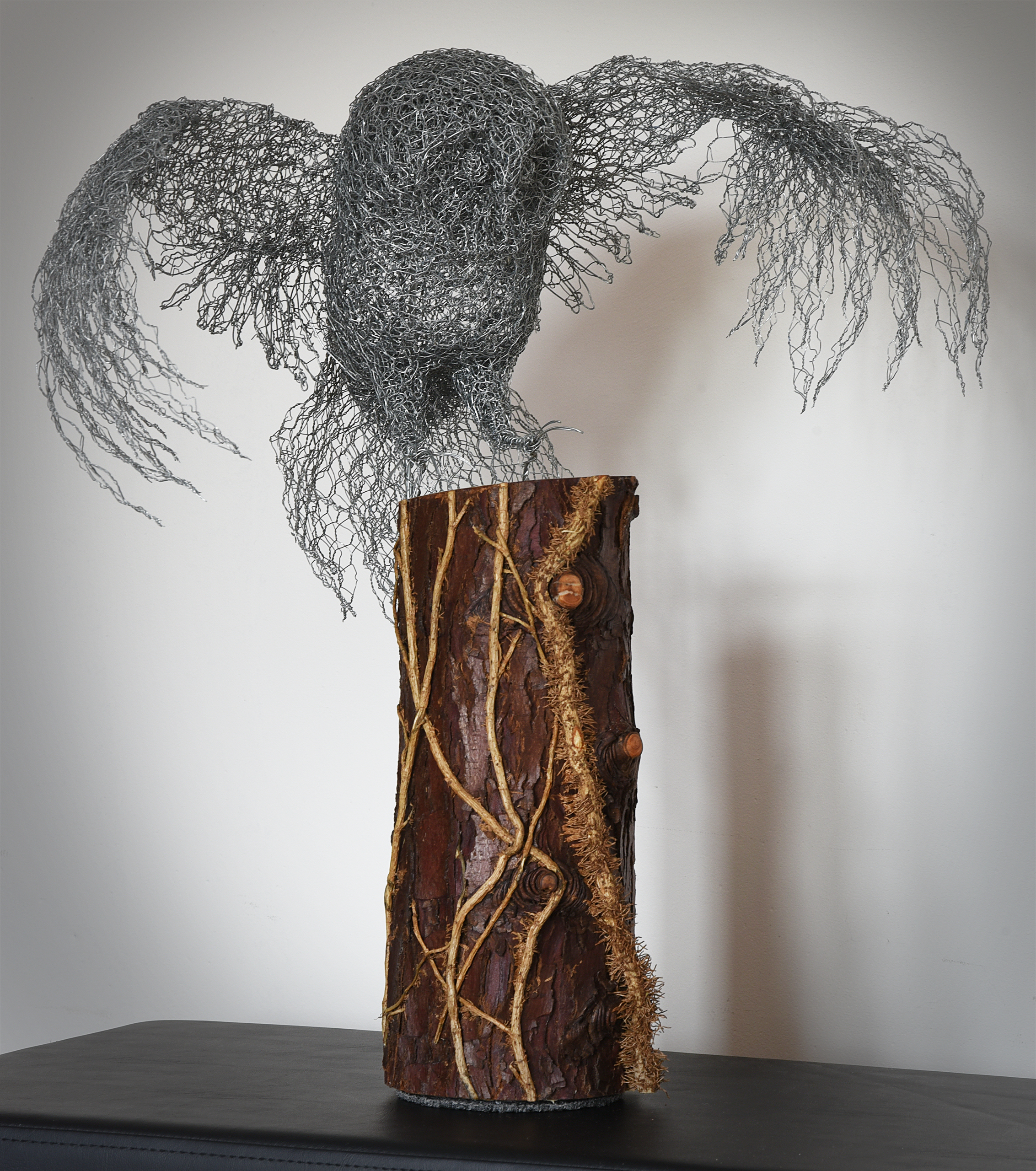 To make it more birdlike, I wanted to make the feathers”feathery” but how? Twisting individual feathers of various sizes from the ragged off cuts of wire and applying them to the outstretched wing seemed to give the desired effect.